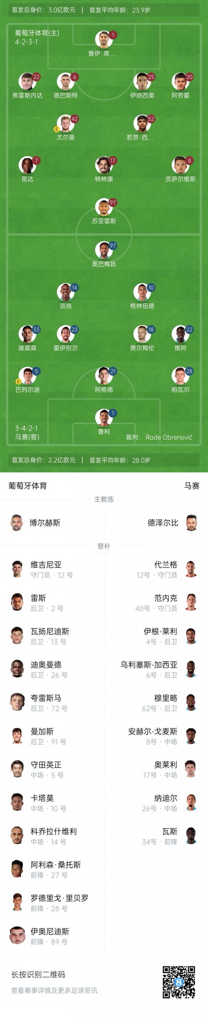 马赛首发:1-鲁利、33-埃莫森、5-巴列尔迪、21-阿诺德、28-帕瓦尔、18-费尔梅伦、23-霍伊别尔、14-派尚、22-维阿、10-格林伍德、97-奥巴梅扬